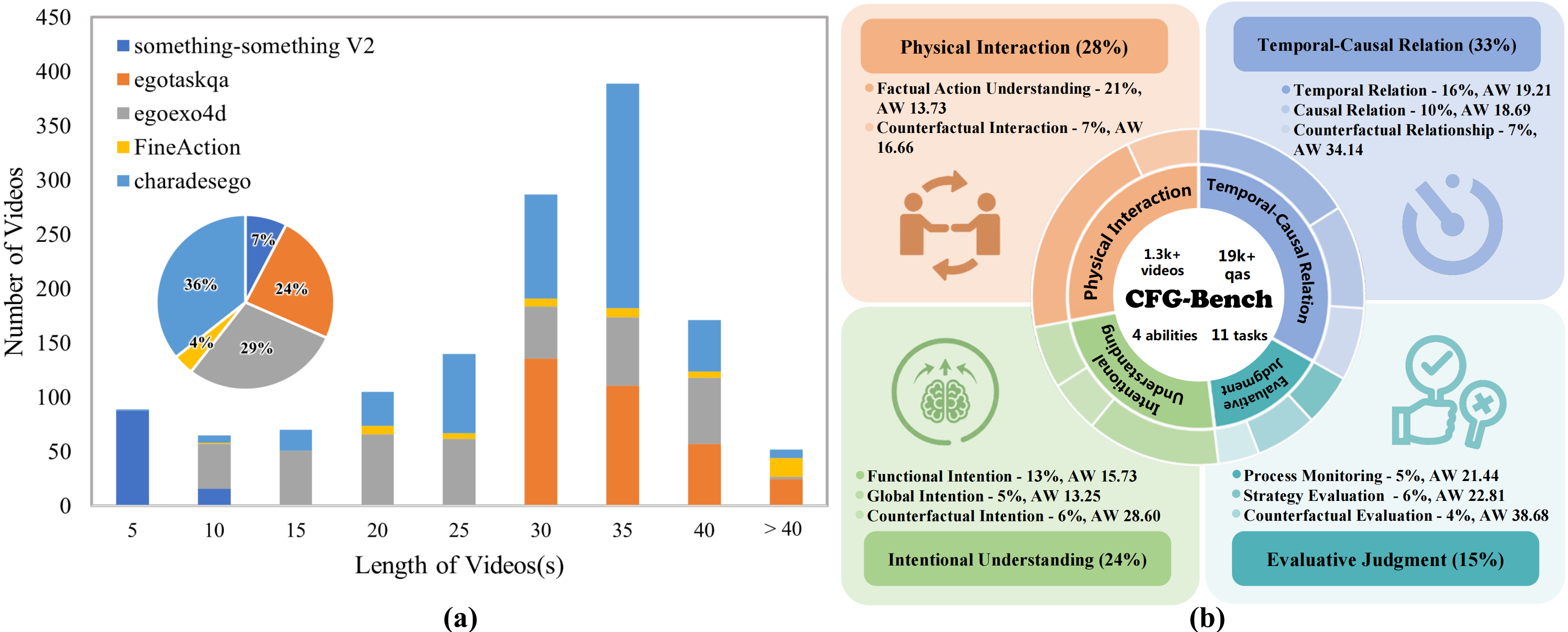Data statistics of CFG-Bench. (a) Distribution and video length statistics of the five datasets. (b) The distribution of tasks across four tiers. AW means average words of questions.