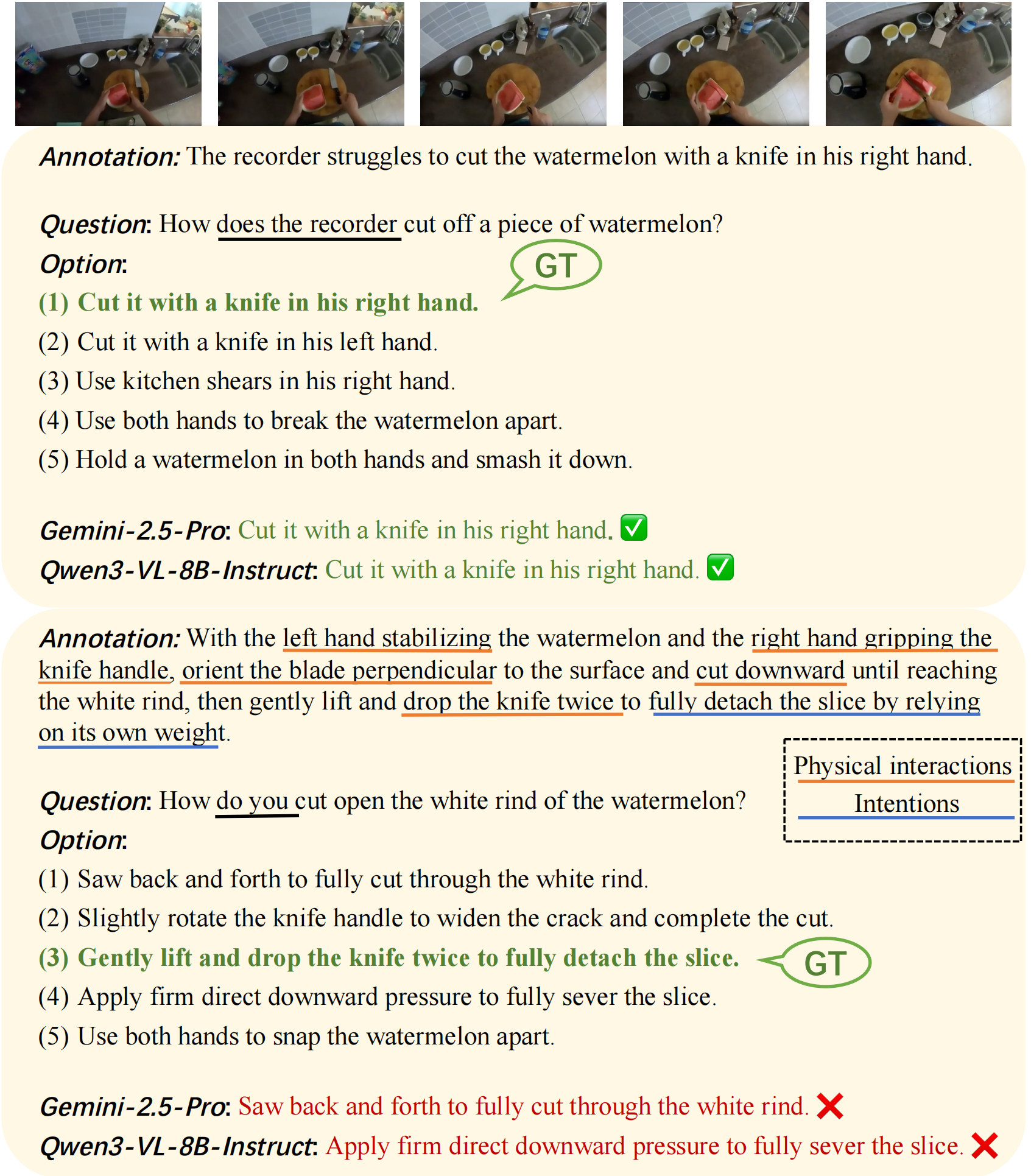 Illustration of CFG-Bench's focus on embodied intelligence over descriptive accuracy. The top part shows how FAVOR-Bench annotates and questions from a third-person perspective, a task which current MLLMs can often solve. In contrast, the bottom part demonstrates CFG-Bench's fine-grained annotation and first-person scenario questions, which probes for the actionable physical and intentional details necessary for embodied agents. Current MLLMs struggle to master the crucial fine-grained details required for physical interaction.
